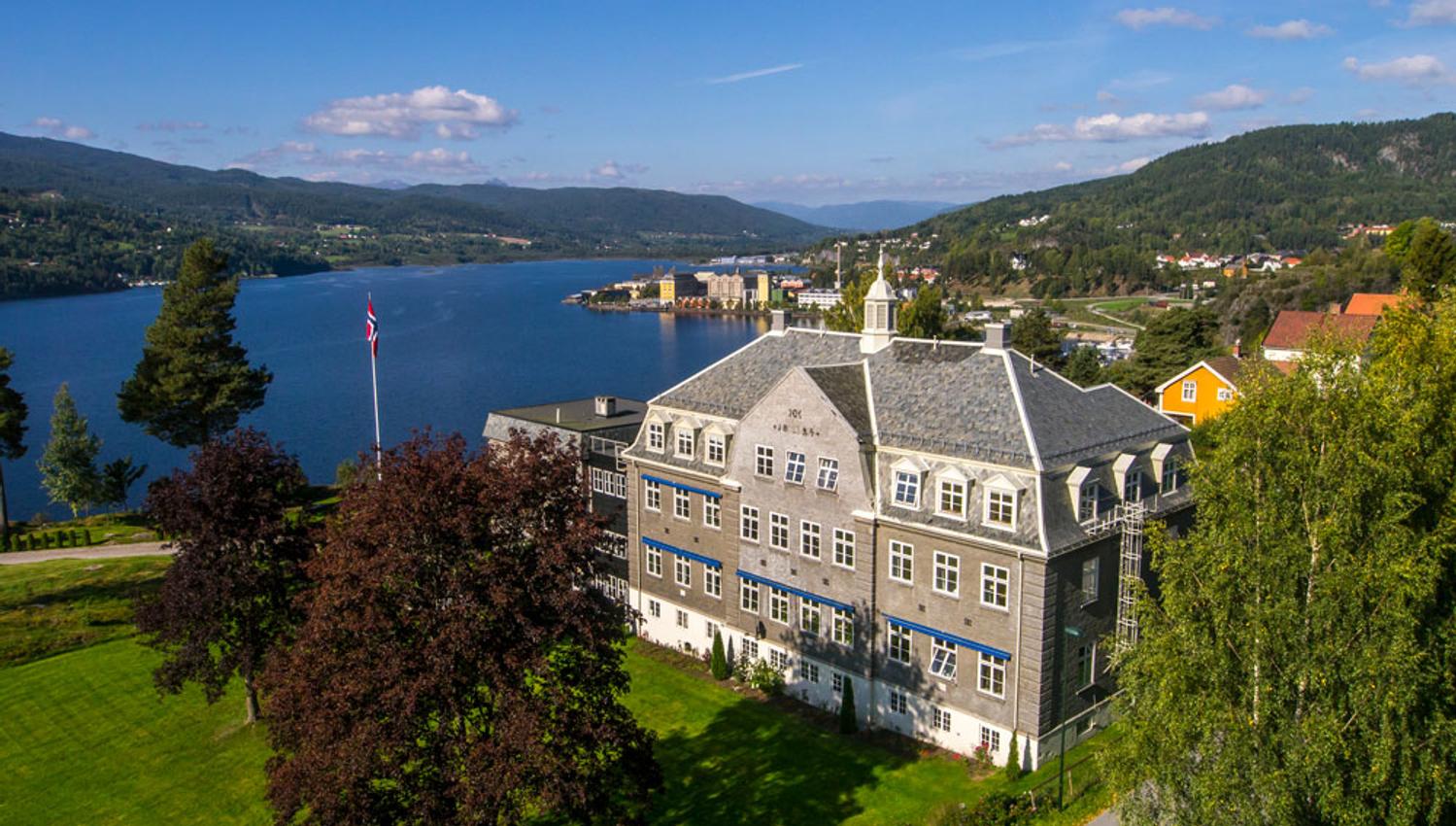• great terrace at Brattrein Hotel with a view of the lake Norsjø